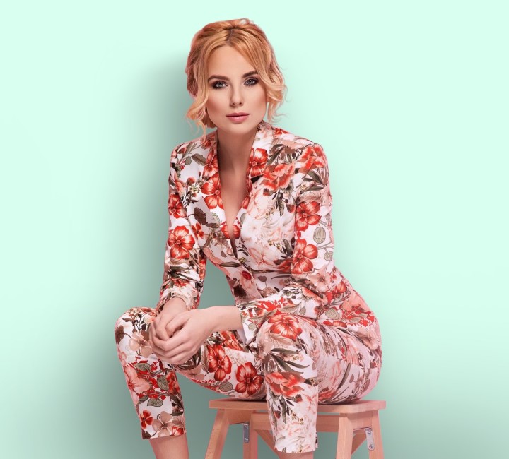 Kadın uzun kollu göğüs dekolteli ithal krep bluz ve pantolon ikili takım